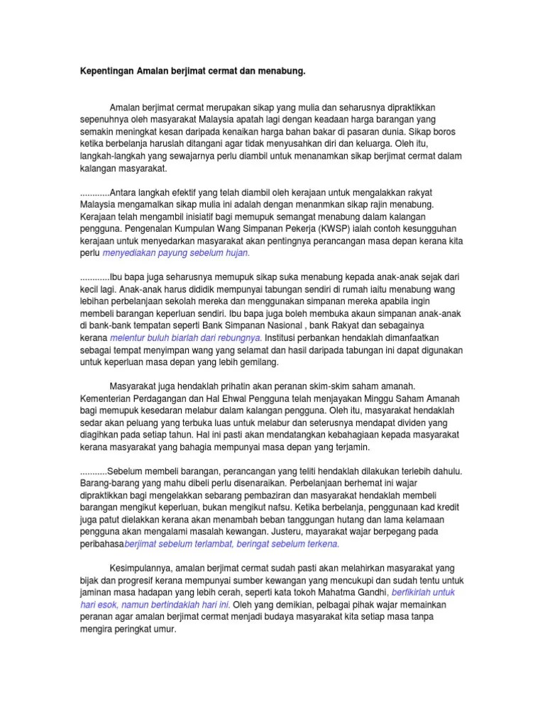 Amalan berjimat cermat ini sememangnya. Contoh karangan Amalan Menabung Karangan 1. Huraikan langkah-langkah untuk memupuk amalan berjimat cermat dalam kalangan masyarakat.